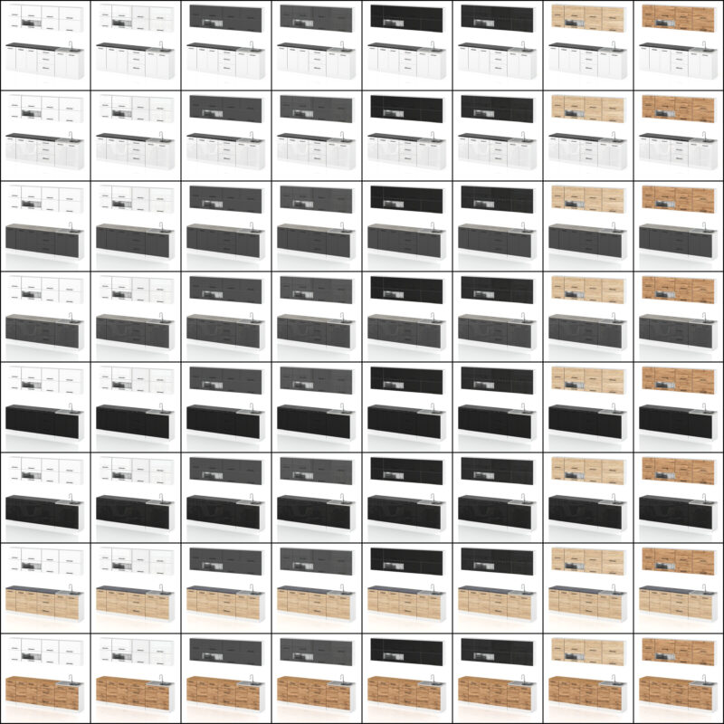 - Kolorystyka: Zestaw dostępny w 64 wariantach kolorystycznych. Istnieje możliwość mieszania kolorystyk szafek górnych oraz dolnych