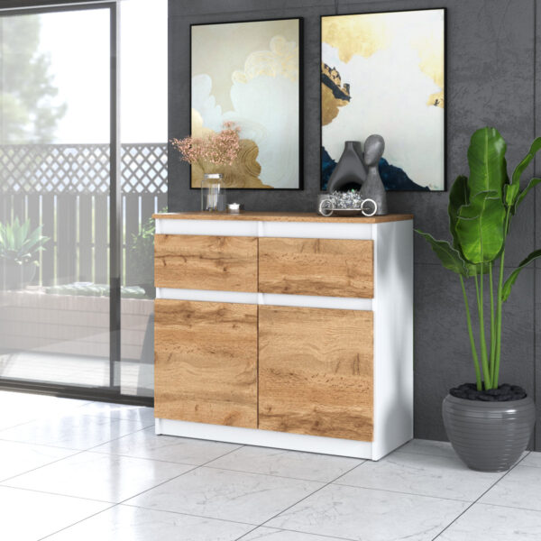 Zestaw Hugo 84 Komody z 12 szufladami na bialym tle z korpusem w kolorze dab lancelot i frontami w kolorze dab lancelot