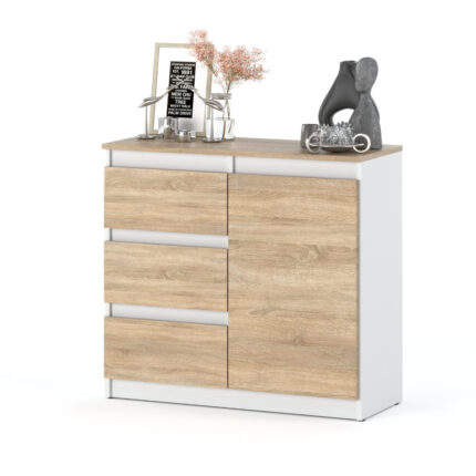 Komoda Hugo z 6 szufladami na bialym tle z korpusem w kolorze bialy mat, blatem w kolorze dab wotan i frontami w kolorze dab wotan