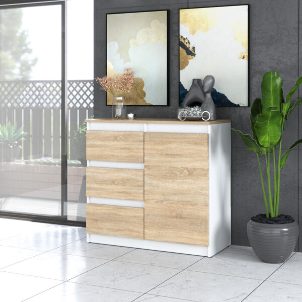 Zestaw Hugo 84 Komody z 12 szufladami na bialym tle z korpusem w kolorze bialy mat, blatem w kolorze dab wotan i frontami w kolorze dab wotan