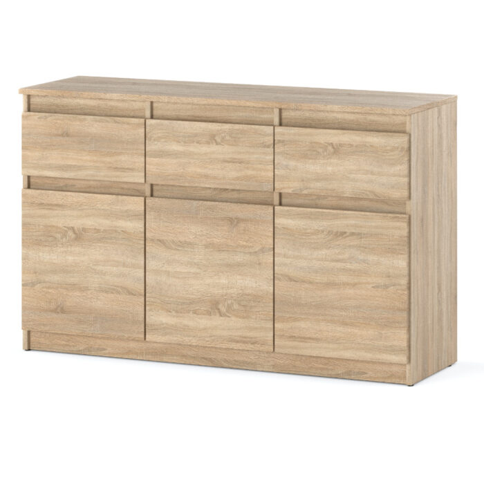 Komoda Hugo z 8 szufladami na bialym tle z korpusem w kolorze dab lancelot i frontami w kolorze dab lancelot