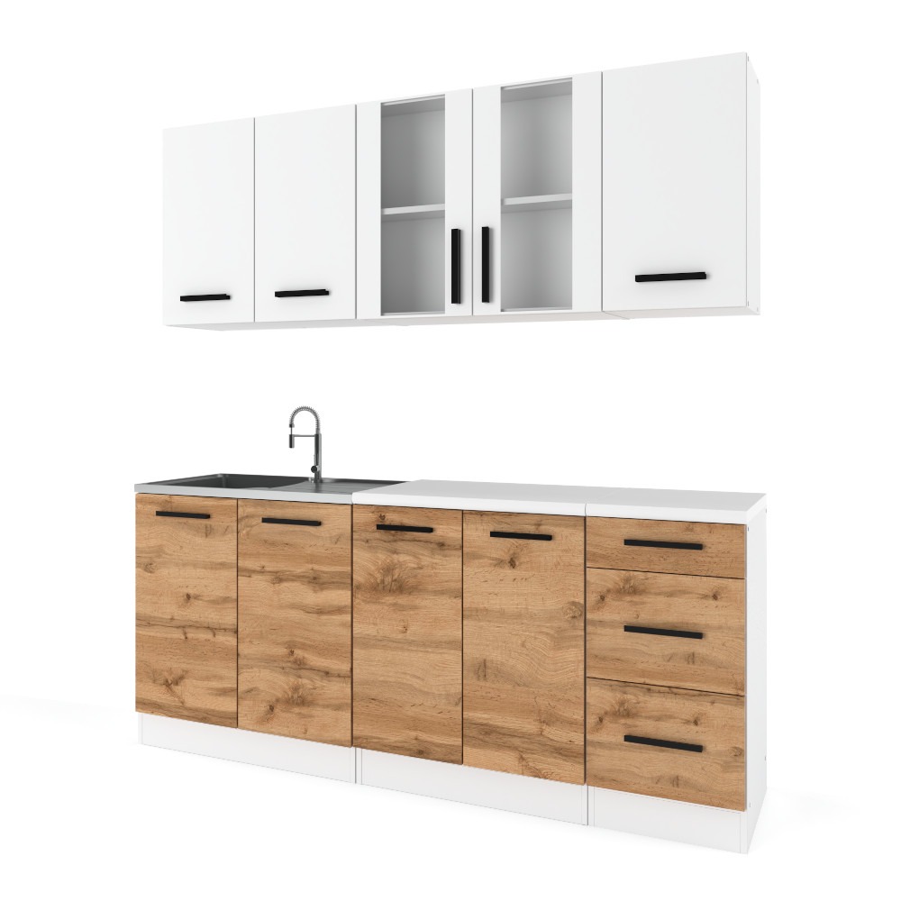 - Elegancka kombinacja białego korpusu i frontów w odcieniach biały i wotan, zapewniająca ponadczasowy wygląd.