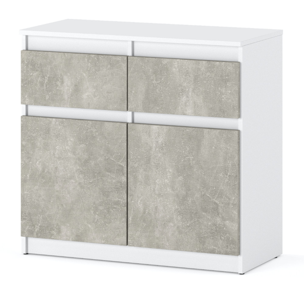 Co powiesz na to, by wreszcie w domu zapanował porządek? Świetnie się składa, bo w naszym sklepie znajdziesz komodę Oleksa z korpusem w kolorze biały mat i frontami w kolorze beton. To mebel, który tworzy piękne wnętrze i ułatwia codzienną organizację. Kompaktowa i prosta w formie komoda to doskonały sposób na przytłaczający Cię bałagan. Wyposażona w dwie szuflady płynnie wysuwane na wygodnych prowadnicach rolkowych. Dwie górne szuflady pomieszczą drobne przedmioty jak klucze, dokumenty czy kosmetyki. Z kolei w dolnej części mebla umieszczone zostały dwie większe szuflady, tak by pomieścić w nich np. ubrania, pudełka z butami, czy zabawki dzieci. Komoda z szufladami Oleksa z korpusem w kolorze biały mat i frontami w kolorze beton doskonale sprawdzi się w każdym pomieszczeniu w domu, bez względu na przeznaczenie. Jest nieduża, dlatego zmieści się nawet w małej łazience czy kuchni. Brzegi wykończone są gładką, listwą PCF, zabezpieczającą mebel przed wilgocią. Minimalistyczne wzornictwo komody do salonu Oleksa z korpusem w kolorze biały mat i frontami w kolorze beton dopełni każde wnętrze niezależnie, w jakim stylu zostało urządzone. To zasługa prostej i zarazem wytrzymałej konstrukcji z wystarczająco szerokim blatem, byś mógł umieścić na komodzie Oleksa swoje ulubione dekoracje i pamiątki. Zastosowane bezuchwytowe szuflady dopełniają skandynawski wygląd mebla.