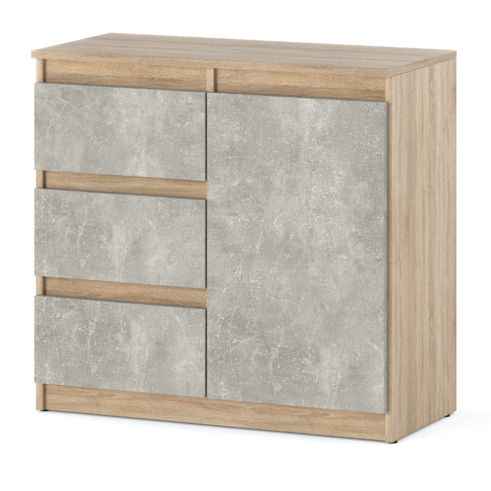 Pragniesz cieszyć się harmonijnym wnętrzem, gdzie wszystkie przedmioty i ubrania mają swoje miejsce? Nadal nie możesz wybrać mebla, który spełni Twoje oczekiwania? Mamy na to sposób! komoda do salonu Agnes to mebel, który jest na tyle praktyczny i świetnie się prezentuje, że nie przejdziesz obok niego obojętnie. Wyposażony w bezuchwytowe trzy pojemne szuflady płynnie wysuwane, dzięki prowadnicom rolkowym. Dodatkowo komoda posiada praktyczną szafkę przedzieloną półką, w której zmieścisz delikatne rzeczy jak szkło i porcelana. Z kolei w szufladach znajdzie się miejsce na drobne przedmioty jak ładowarki, baterie, piloty, a także ubrania i zabawki i akcesoria dla dziecka. Minimalistyczne wzornictwo komody z szufladami Agnes z korpusem w kolorze dąb sonoma i frontami w kolorze beton utrzymane w stylu scandi świetnie komponuje się w wielu aranżacjach, niezależnie, czy jest to styl klasyczny, czy nowoczesny. Prosta forma komody do salonu Agnes z korpusem w kolorze dąb sonoma i frontami w kolorze beton równie dobrze sprawdzi się także w sypialni, pokoju dziecka czy łazience. Gładkie brzegi i przestronny blat idealny do wyeksponowania cennych pamiątek i dekoracji. Dzięki funkcjonalnej i stylowej komodzie z szufladami Agnes wreszcie pożegnasz chaos, a w domu zapanuje idealny porządek. Ciesz się relaksem, nie myśląc już o bałaganie!