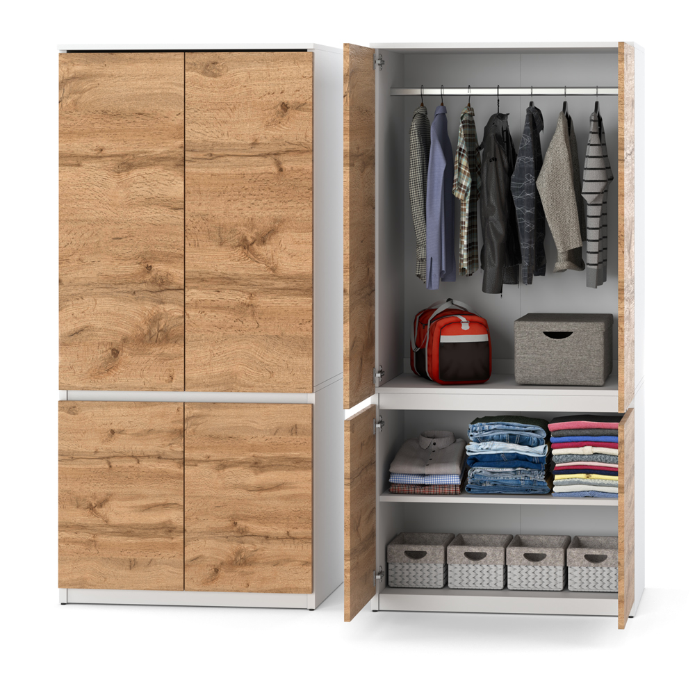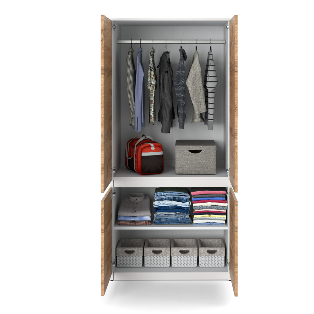 - Przemyślany układ wnętrza: Cztery drzwiczki skrywają przestronne wnętrze z drążkiem na ubrania oraz dolną półką, idealną do przechowywania obuwia czy akcesoriów.