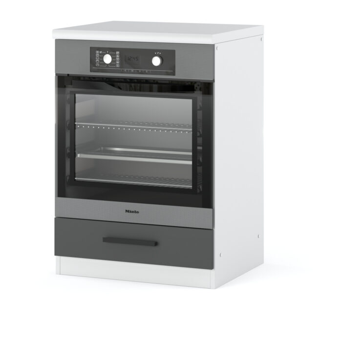 Kuchnia Mini Mokka na bialym tle z korpusem o kolorze bialym i frontach o kolorze szarym