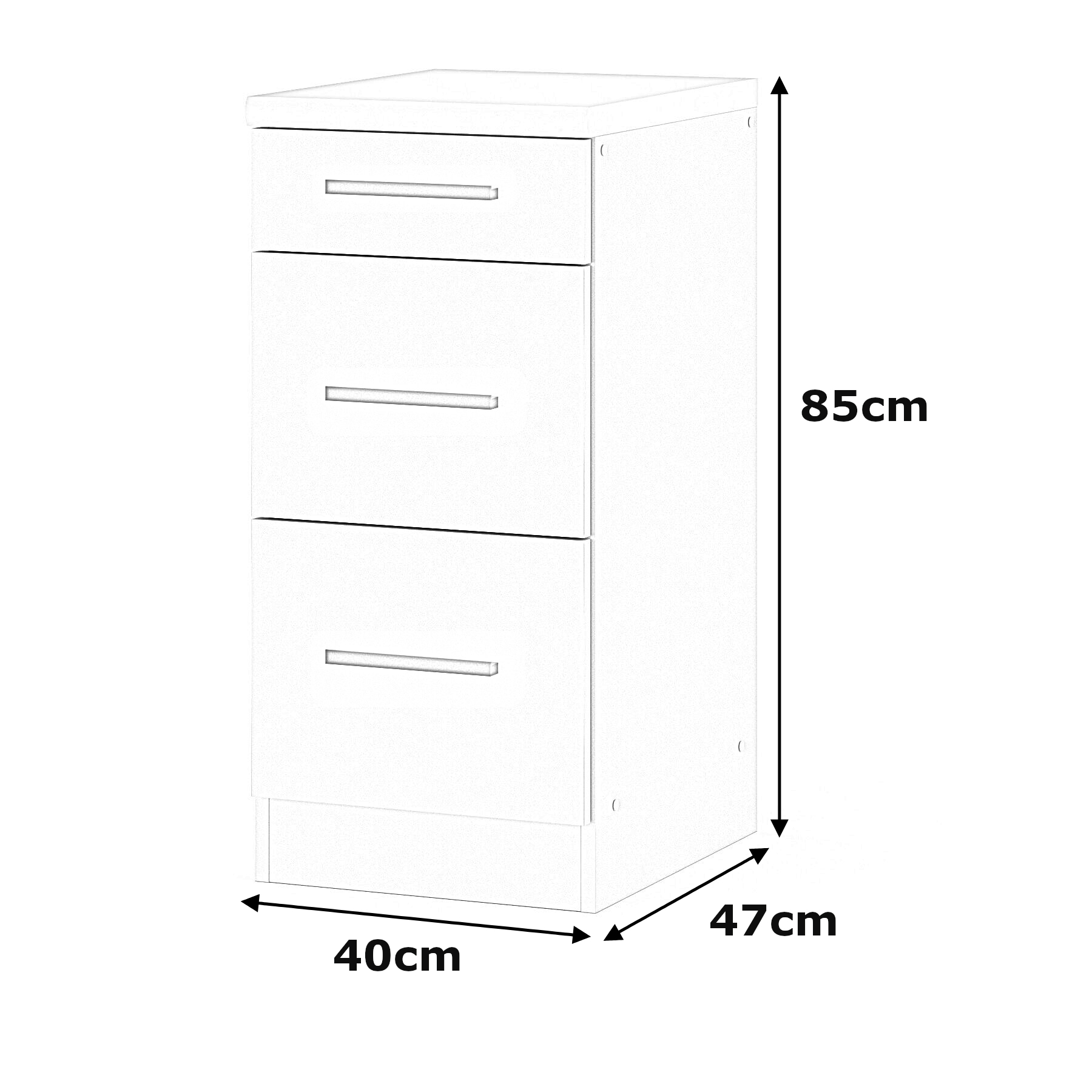 Szafka posiada trzy półki, które umożliwiają łatwe posortowanie rzeczy i utrzymanie porządku. Brak drzwiczek zapewnia łatwy dostęp do przechowywanych przedmiotów. Szafka stojąca o wymiarach 47cm x 82cm x 40cm (głębokość x wysokość x szerokość) jest pojemna, a jednocześnie nie zajmuje dużo miejsca. Uchwyty w kolorze czarnym i pojemne wnętrze szuflad wpływają na wygodę użytkowania.