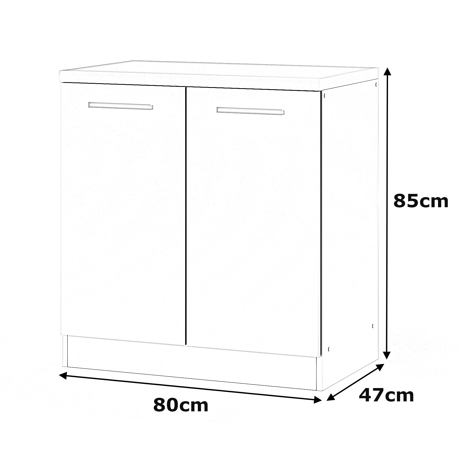 Nie ma w niej szuflad, co sprawia, że jest minimalistyczna i funkcjonalna. Wysokość 85 cm i szerokości 80 cm, głębokość 47 cm, pozwala na przechowywanie przedmiotów o dużych gabarytach. Cokół i wieniec są utrzymane w kolorze korpusu, a tylna płyta HDF również doskonale komponuje się z całością.