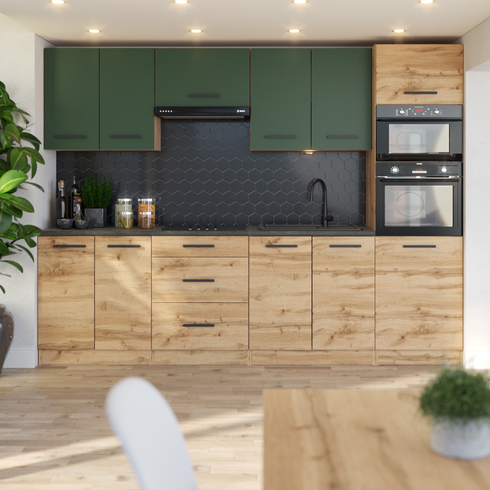 Zestaw Mebli Kuchnnych Remino 2,6m na bialym tle z korpusem w kolorze bialy mat i frontach w kolorze dab wotan szary mat