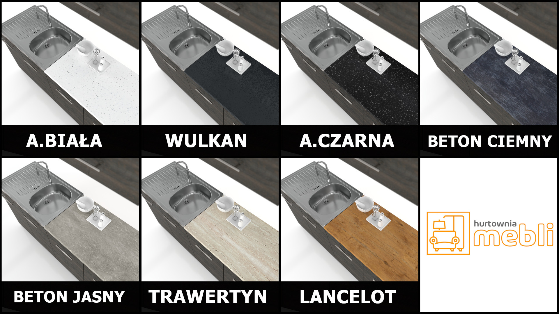 W zestawie jest 180cm blatu który można wybrać w jednym z siedmiu poniższych wersji kolorystycznych: