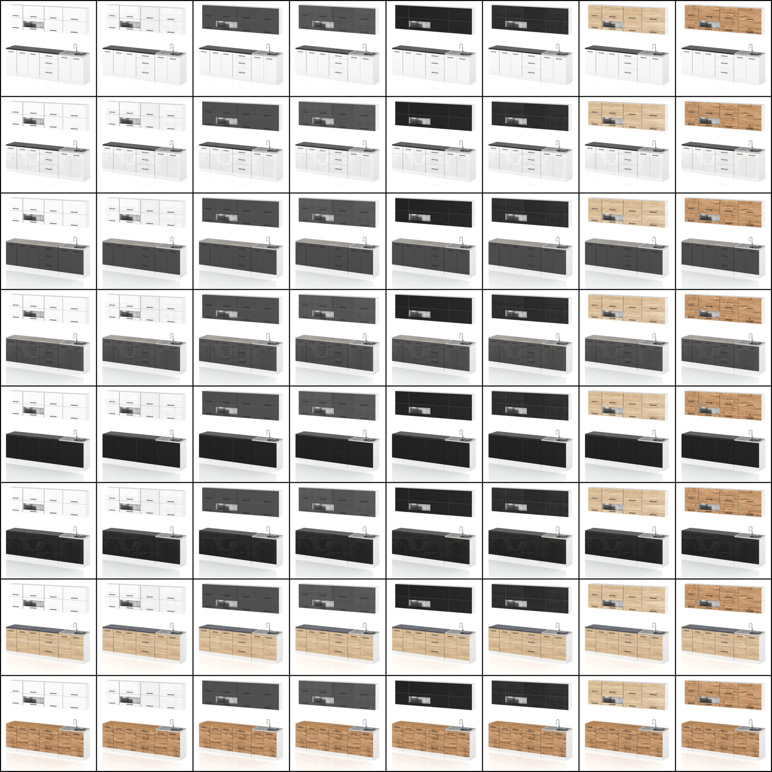 - Kolorystyka: Zestaw dostępny w 64 wariantach kolorystycznych. Istnieje możliwość mieszania kolorystyk szafek górnych oraz dolnych